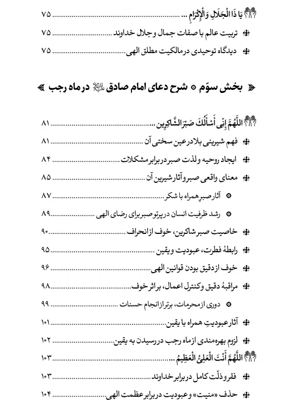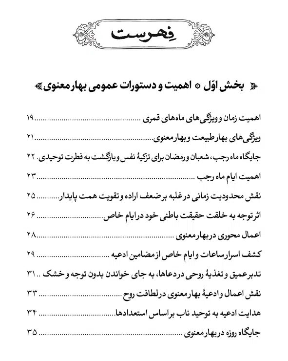این کتاب با تبیین جایگاه بهار معنوی و ماه رجب و بیان دستورات عمومی این ماه آغاز میشود؛ سپس خواننده را به انس با دعاهای این ماه و توجه به منزلت این ادعیه رهنمون میسازد، به تعمیق مباحث توحیدی میپردازد و در نهایت، به شناخت نسبت انسان با ولایت میانجامد.