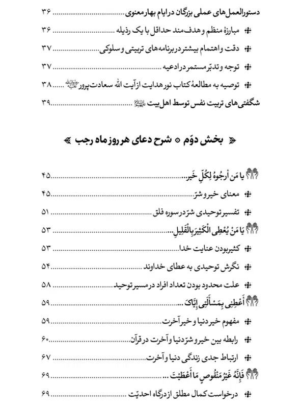 این کتاب با درک همین جایگاه، تلاش دارد مسیر استفاده از این فرصت را روشن کند و مجموعهای از معارف، شرحها و نکات راهگشا را در اختیار خواننده قرار دهد. هدف، آمادگی برای مسیری که در آن، انسان بهجای بسندهکردن به انجام ظاهری اعمال، به معانی آنها نزدیک شود و از ارتباط میان دعا، عمل، معرفت و تربیت غافل نماند. در این نگاه، ماه رجب نه صرفاً یک تقویم عبادی، بلکه یک دورهٔ آموزشی و تربیتی است که ساختار و محتوای آن در معارف اهلبیت (ع) تبیین شده است.